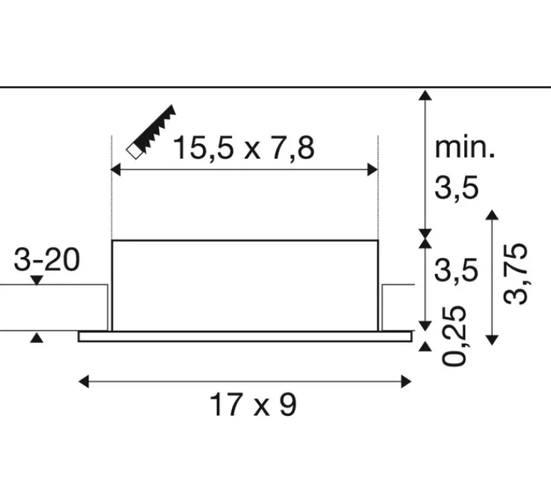 La source lumineuse est non incluse, nous vous conseillons 2 ampoules max 10W. Les dimensions d’encastrement sont : 15,5 cm de longueur, 7,8 cm de longueur et 5 cm de profondeur.