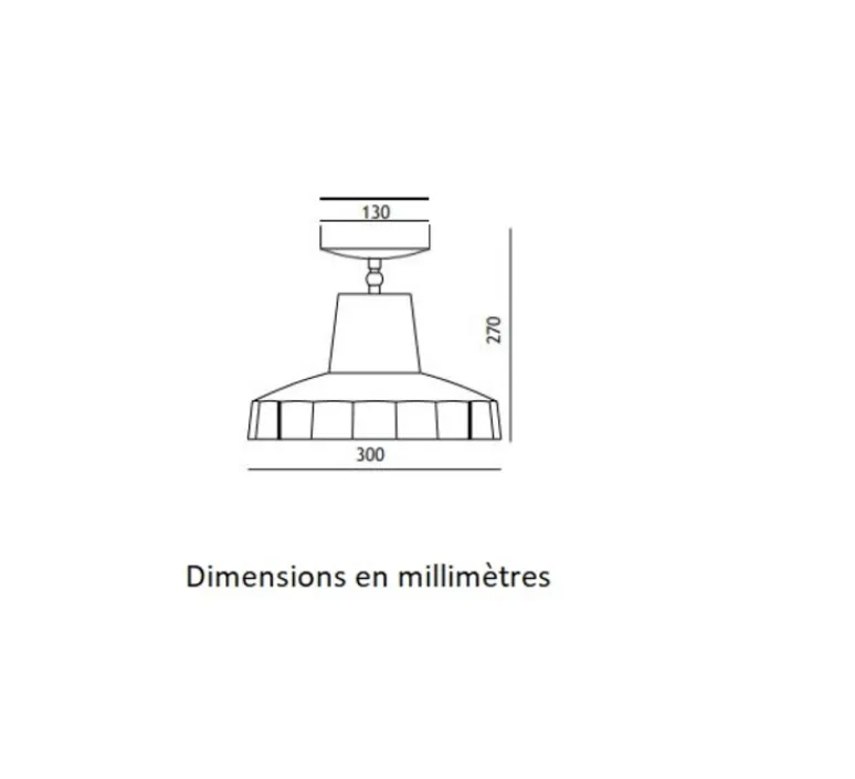 Le plafonnier mesure 30 cm de diamètre pour une hauteur de 27 cm à une hauteur maximale de 1,5 m. La rosace mesure 13 cm de diamètre.