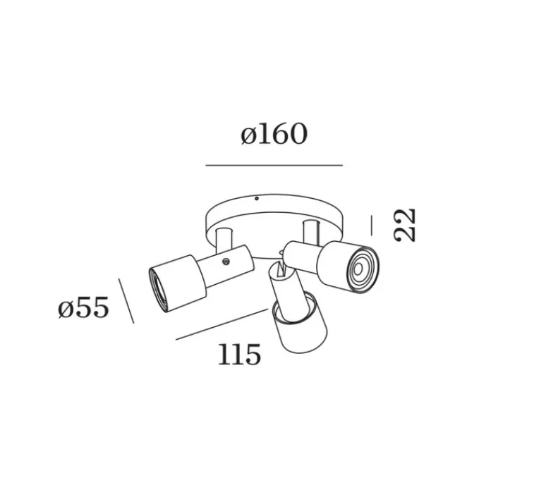 La base de Sara mesure 16 cm de diamètre et supporte 3 spots de 5,5 cm de diamètre et 11,5 cm de hauteur.