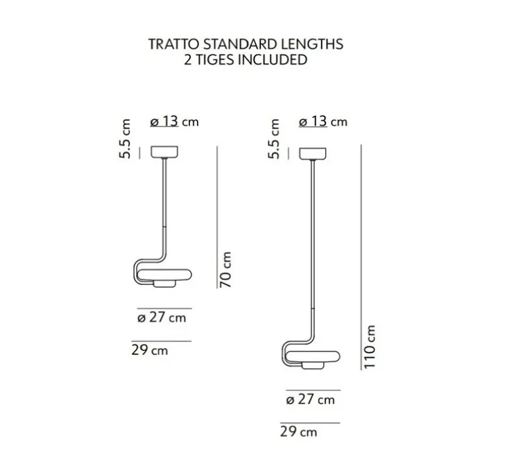 Tratto intègre un module LED dimmable émettant une lumière douce à 2700K, avec une puissance de 1450 lumens et un excellent rendu des couleurs (IRC >90). Il diffuse une lumière fixe à 360°, idéale pour un éclairage décoratif et homogène. Le luminaire mesure 27 cm de long et s’installe en plafonnier avec une hauteur ajustable selon la tige choisie.
