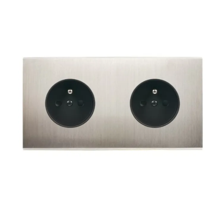 Ce produit, Prise-2P+T x2, de couleur noire, mesure L15,1cm et H8cm et est fabriqué en laiton massif.