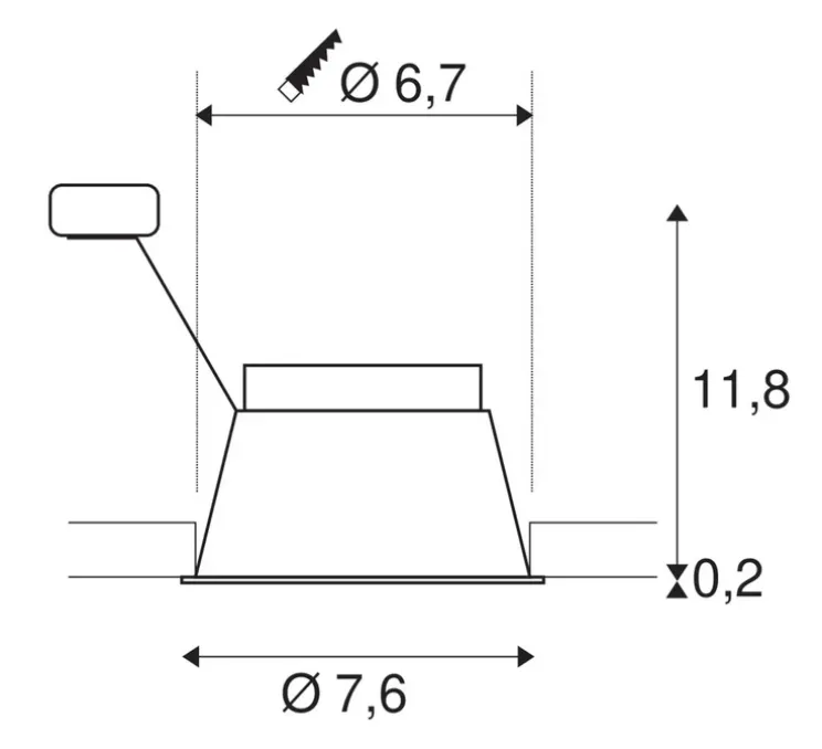 Le spot Horn muser 7,6cm de diamètre pour 12cm de hauteur. La profondeur d’encastrement est de 13cm. La source est non incluse, nous préconisons une ampoule de type GU10.