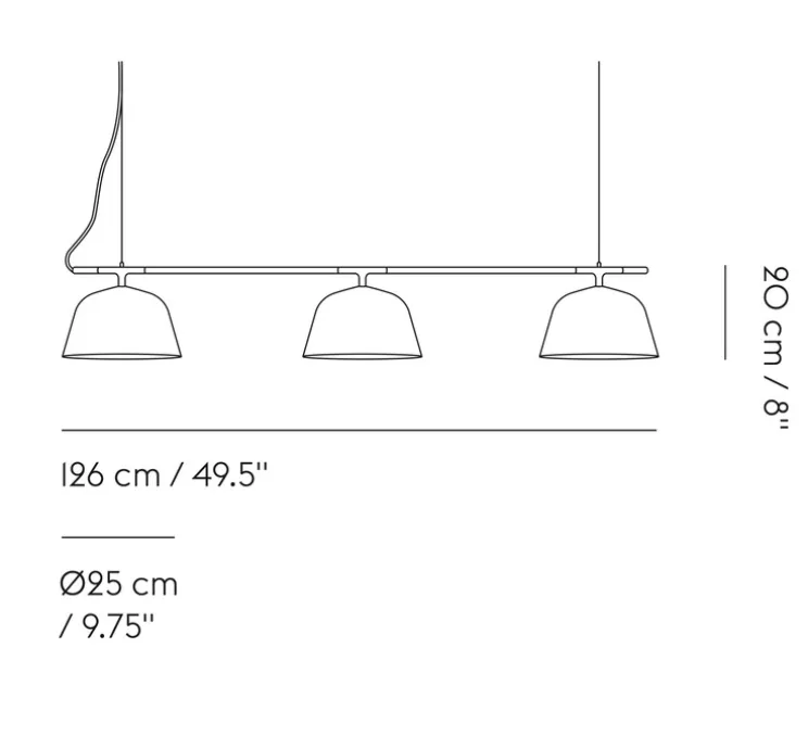 Sa longueur est de 126cm et sa hauteur de 20cm. Le diamètre des abat-jours est de 25cm. Les deux câbles de la suspension mesurent 3,5m et le cordon 4m. La rosace blanche est incluse. Les 3 ampoules LED E14 ne sont pas incluses. Fonction dimmable.
