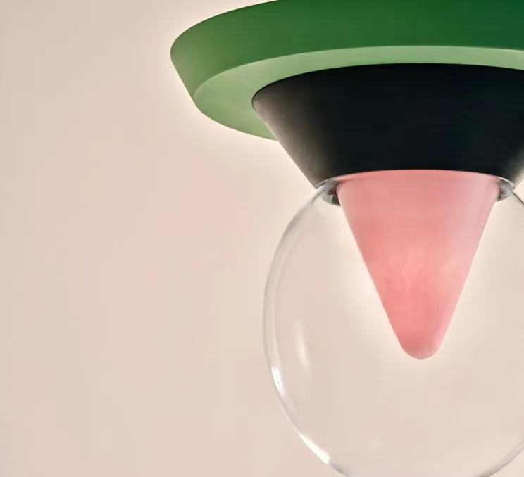 Sa silhouette conique associe un verre transparent soufflé à la main, un entonnoir intérieur teinté rose, une céramique vert foncé mate et du bois vert clair laqué mat. La palette de couleurs, douce mais affirmée, met en valeur la force tranquille qui se dégage de Bia. Suspendue au-dessus d’un îlot central, dans un salon ou un hall d’entrée, elle affirme une présence sculpturale et diffuse une lumière enveloppante, idéale pour créer une atmosphère sereine et habitée.