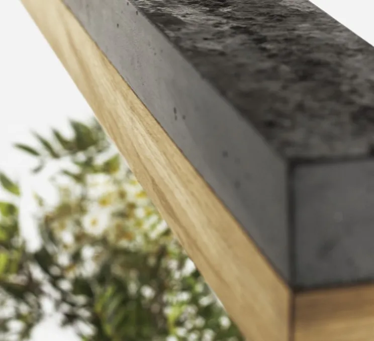 Cette suspension longiligne mélange le naturel avec le chêne et l’industriel avec le béton coloré noir .