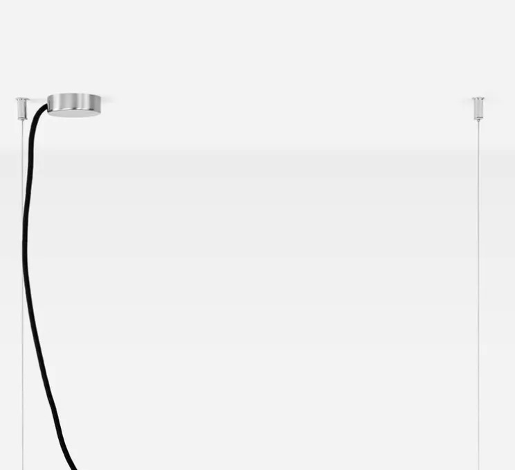 La suspension est vendue avec une rosace ronde en acier pour cacher la partie électrique de l’ensemble; et le système de fixation des 2 câbles d’acier n’inclut pas d’accroches spécifiques afin que la suspension puisse être suspendue sur n’importe quel type de surface, en fonction de votre plafond (bois, béton,..).