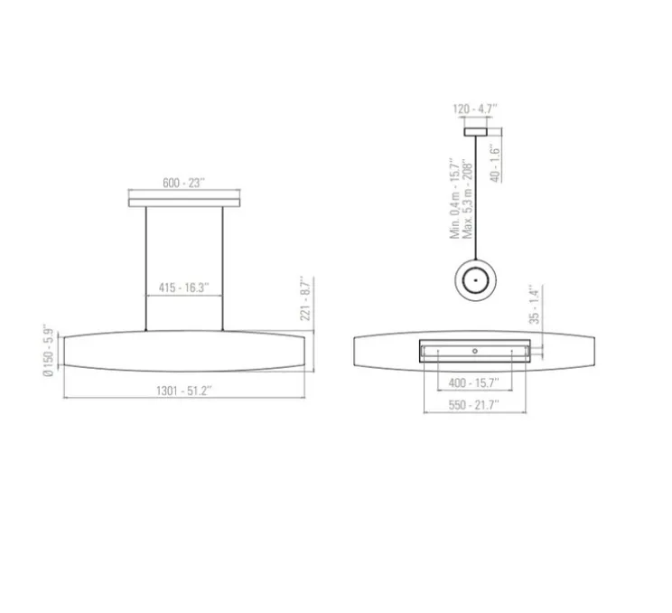 La suspension mesure 130 cm de longueur et 22 cm de hauteur. La source lumineuse 2700K, 6600lm est fournie.