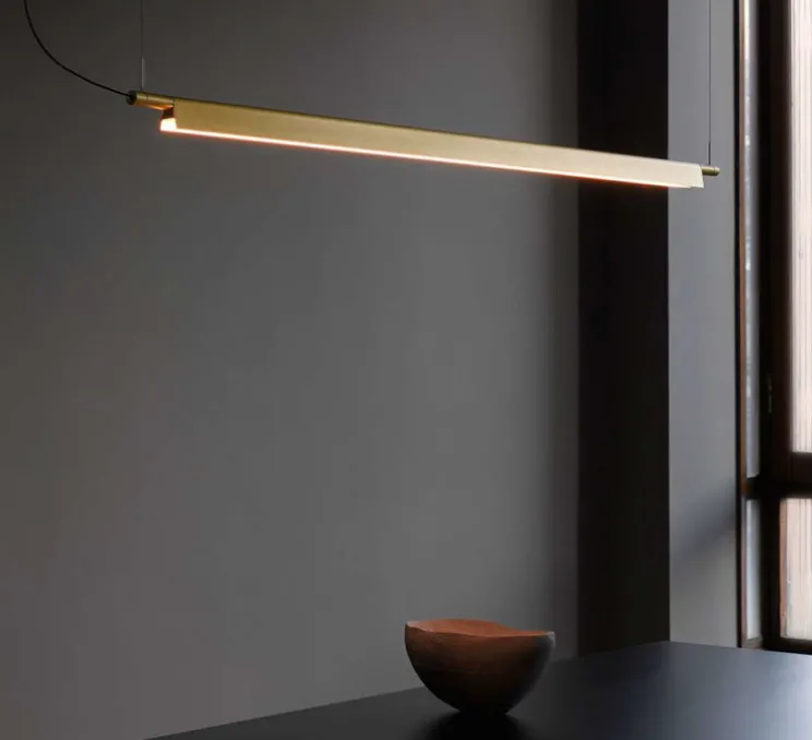 Les dimensions de la suspension sont de 162,5 cm pour la longueur et 4,57 cm de hauteur. Le câble noir est fourni et mesure entre 15 et 300 cm. La source de lumière est incluse : LED 26W, 2700 kelvins (disponible également en 3000 kelvins sur demande). Les couleurs laiton et aluminium sont de 1926