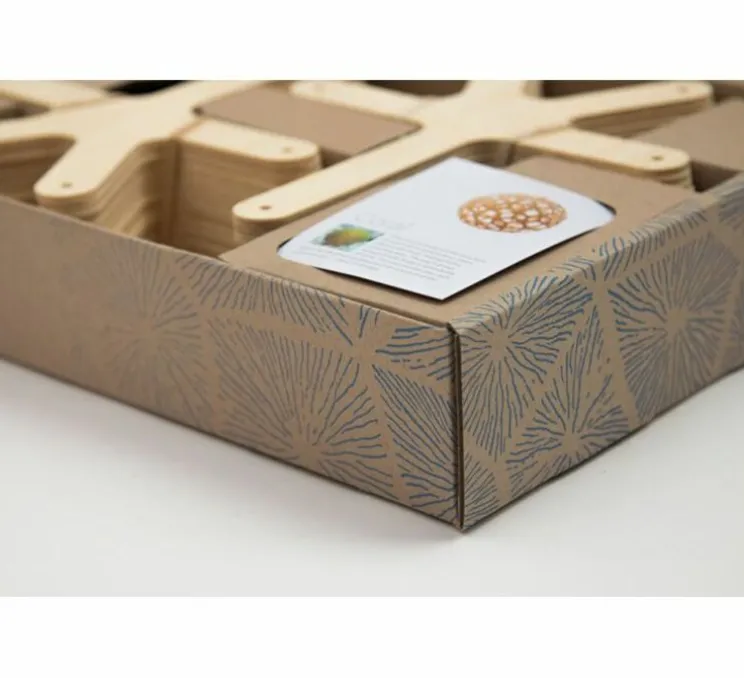 La suspension Coral est basée sur l’un des polyèdres géométriques auxquels s’est intéressé David Trubridge depuis son enfance. Il déploie ses connaissances géométriques dans la fabrication d’objets fonctionnels, ici l’abat-jour, composé de 60 pièces identiques assemblées les unes aux autres.