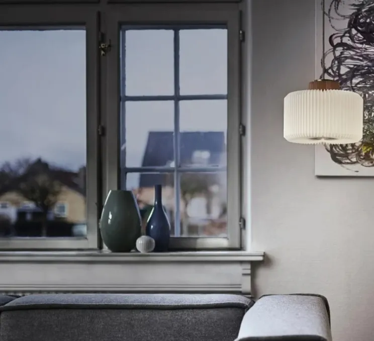 Fabriquée à partir d’une feuille de plastique plissée à la main, la suspension Cylinder est chaleureuse et accueillante, émettant une douce lumière qui créée une atmosphère agréable. Il existe trois différentes tailles de suspension et en deux coloris différents. Les trois lampes suspendues de la collection sont magnifiques seules, en rangée ou en grappe de trois tailles différentes, créant un effet de roue dentée. L’équipe de conception a créé un joli contraste dans cette suspension en utilisant un chêne teinté noir ou un chêne clair et un raccord en acier, créant ainsi une touche moderne sur le design emblématique de Le Klint. Ce luminaire suspendu s’adapte merveilleusement à tous les types d’intérieurs, mais il est particulièrement adapté aux salons et aux salles à manger.