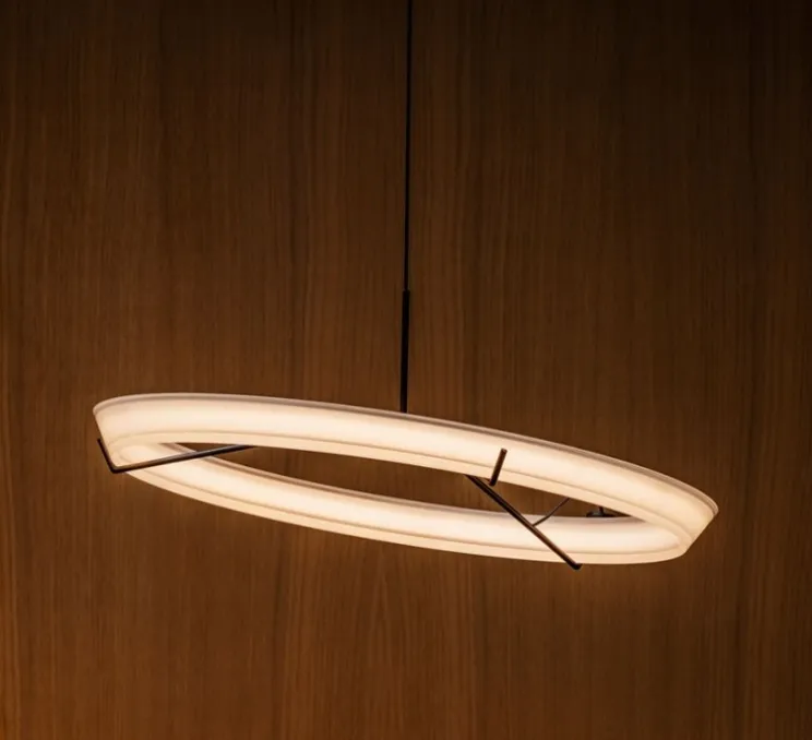 Formées de pièces droites ou circulaires, les suspensions Halo Jewel transforment la lumière en un élément précieux, sertie dans des structures infiniment légères, suspendues dans l’espace.