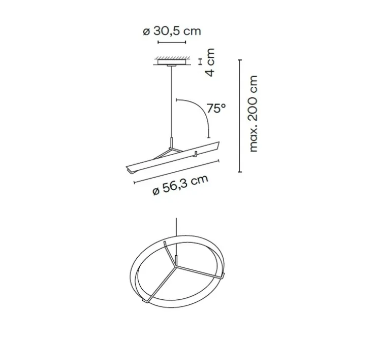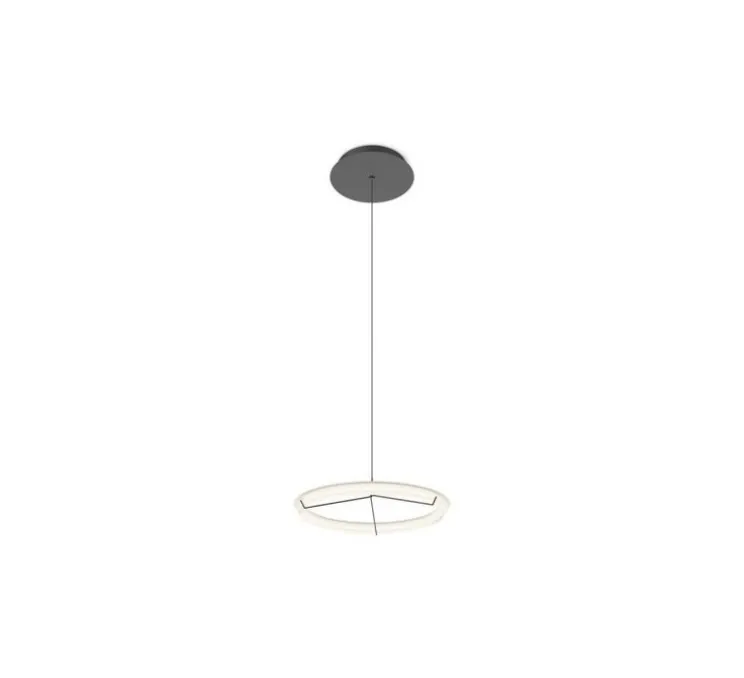 Cette suspension fournit un éclairage d’ambiance au moyen d’un diffuseur circulaire en méthacrylate retenu par une très fine structure d’acier.