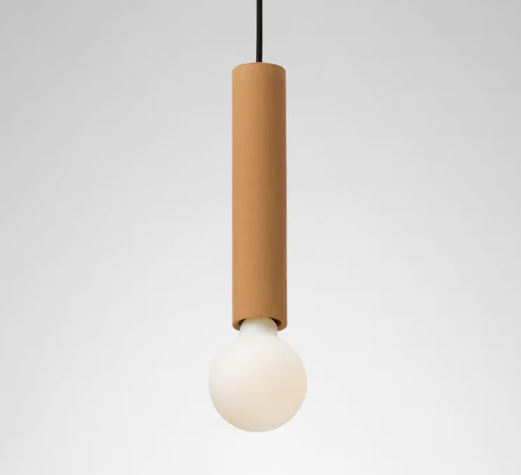 Le modèle Ila revisite la lampe industrielle de manière élégante en créant une suspension où l’esthétique minimaliste rencontre le caractère artisanal du béton coloré.