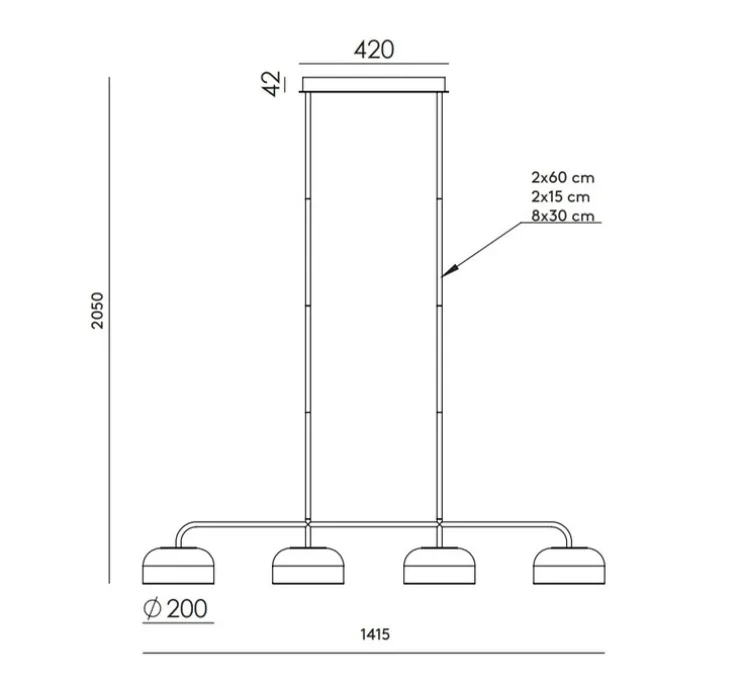 Elle intègre 4 LED, délivrant 2100 lumens et 2700K pour une lumière chaude. Le driver dimmable TRIAC est intégré dans la rosace. Ce luminaire mesure 141,5 cm de longueur et 205 cm de hauteur.