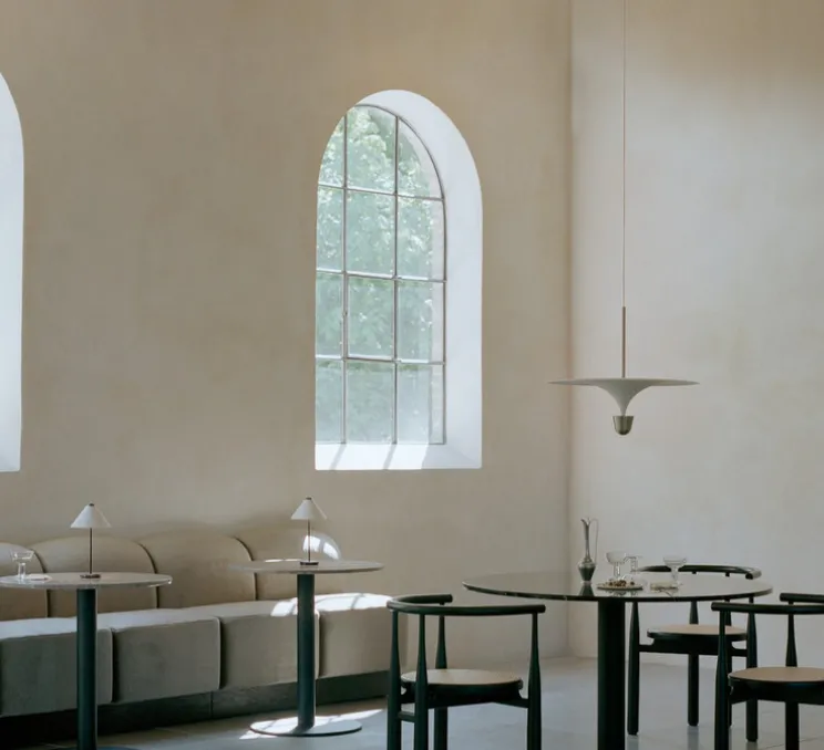 Dotée d’une silhouette circulaire rappelant la forme d’un champignon, Kantarell joue sur les volumes et les contrastes grâce à son double cercle concentrique — l’abat-jour et le réflecteur — qui crée un effet visuel captivant. Le fini nickel apporte une touche contemporaine et sophistiquée, tandis que la lumière indirecte, douce et diffuse, sublime les intérieurs avec discrétion. Idéale au-dessus d’une table de salle à manger ou dans un salon épuré, elle structure l’espace avec finesse.