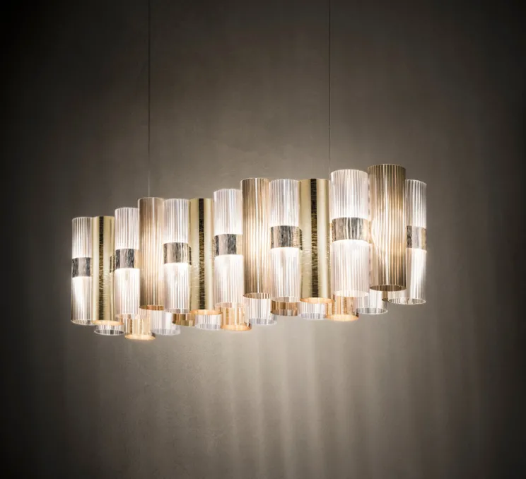 La Lollo est un hommage aux grondements des années 50. Les cylindres en technopolymère, dans des nuances variées de métallisation prismatique contemporaine et de motifs géométriques, alternent autour d’un anneau central éclairé.