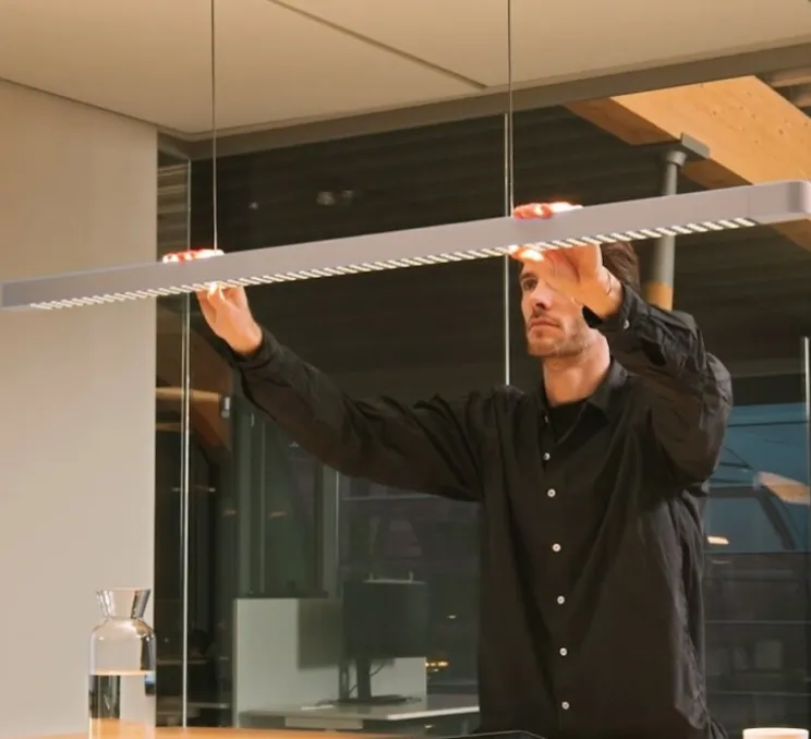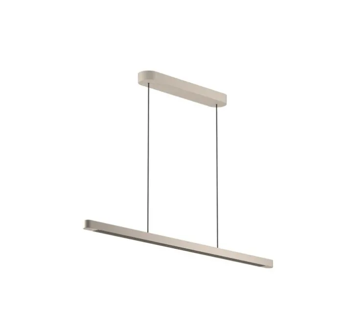 Sa finition sable et ses lignes minimalistes s’intègrent parfaitement dans des bureaux modernes ainsi qu’au dessus de votre plan de travail de cuisine. Dimmable, elle s’utilise aussi avec l’application GRAU en mode Bluetooth pour contrôler l’intensité (jusqu’à 10700lm) et la couleur de la lumière (variant entre 2700K et 4000K), offrant ainsi une ambiance personnalisée en fonction des besoins. La suspension Team, de forme cubique, mesure 137 cm de longueur et 4 cm de hauteur. Avec un IRC supérieur à 94, cette suspension garantit une grande qualité de lumière.