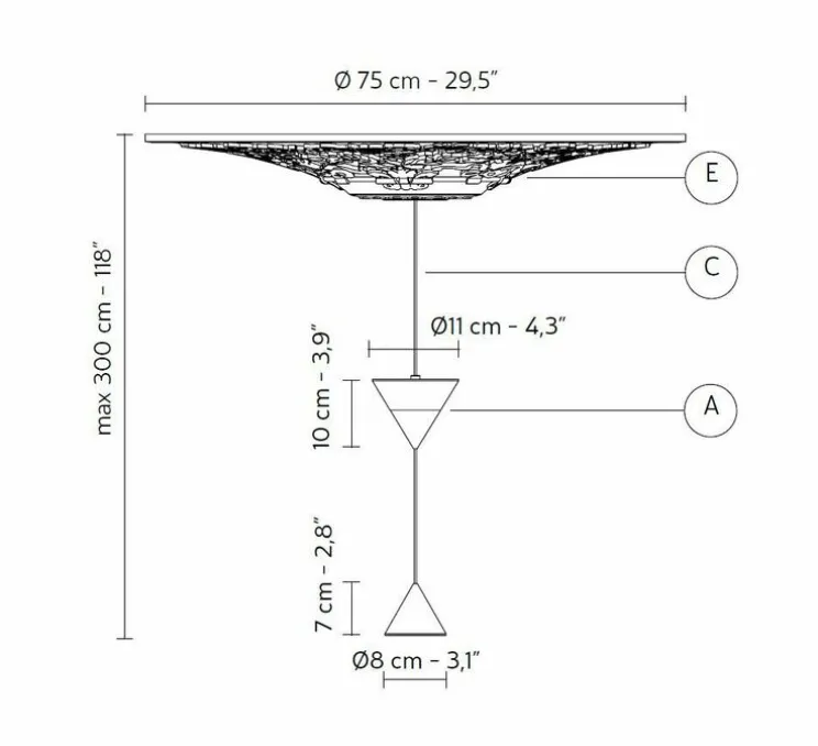 Le système LED d’une puissance totale de 25,2W (top :16,8W et bottom : 8,4W) est intégré et diffuse 3000K et 2728 lumens. Le cône supérieur mesure 11 cm de diamètre et 10 cm de hauteur et le cône inférieur mesure 8 cm de diamètre et 7 cm de hauteur. La rosace a un diamètre de 75 cm. Possède un câble noire ajustable de 3m maximum. Variable en 0-10V. Possède un IRC de 90 promettant un rendu qualitatif des couleurs.