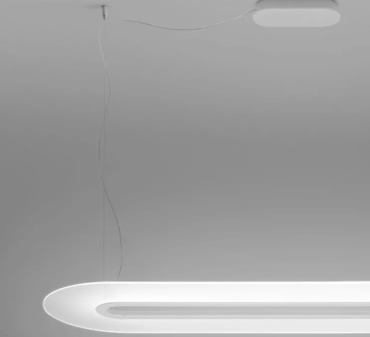 La suspension Opti-Line présente un anneau en aluminium laqué blanc ou avec une finition chromée, abritant une source topLED dimmable avec émission contrôlée de la lumière. Le pavillon en métal est peint en blanc et les câbles porteurs en acier ainsi que le câble conducteur transparent assurent une suspension stable et sécurisée.