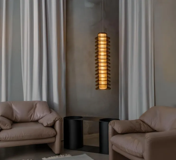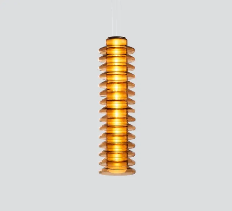 Ce luminaire décoratif, conçu pour les espaces intérieurs, décline une silhouette en verre ambre, montée sur une structure en aluminium. Cette version de la suspension Pace 28 est composée de 15 modules, mais la suspension est entièrement modulable : il est possible de superposer de deux à 15 modules de verre pour créer une composition sur mesure.