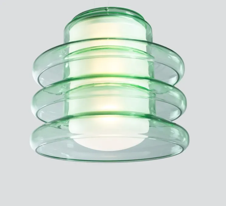 Ce luminaire décoratif, conçu pour les espaces intérieurs, décline une silhouette en verre finition vert d’eau, montée sur une structure en aluminium. Cette version de la suspension Pace 28 est triple, composée de trois modules, mais la suspension est entièrement modulable : il est possible de superposer jusqu’à 15 modules de verre pour créer une composition sur mesure.