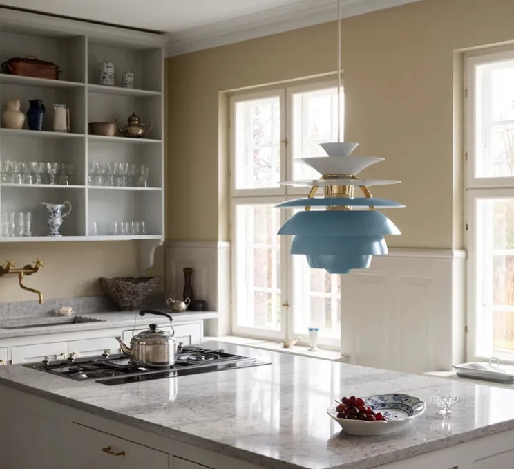 La forme sphérique de la PH Snowball repose sur un empilement de huit abat-jour en aluminium laqué bleu, soutenus par une structure en laiton. Le contraste entre les finitions brillantes sur le dessus et mates en dessous des diffuseurs crée une lumière douce, sans éblouissement. Sa silhouette architecturée convient aux intérieurs scandinaves ou modernes, suspendue au-dessus d’une table de repas, dans un salon ou un hall.