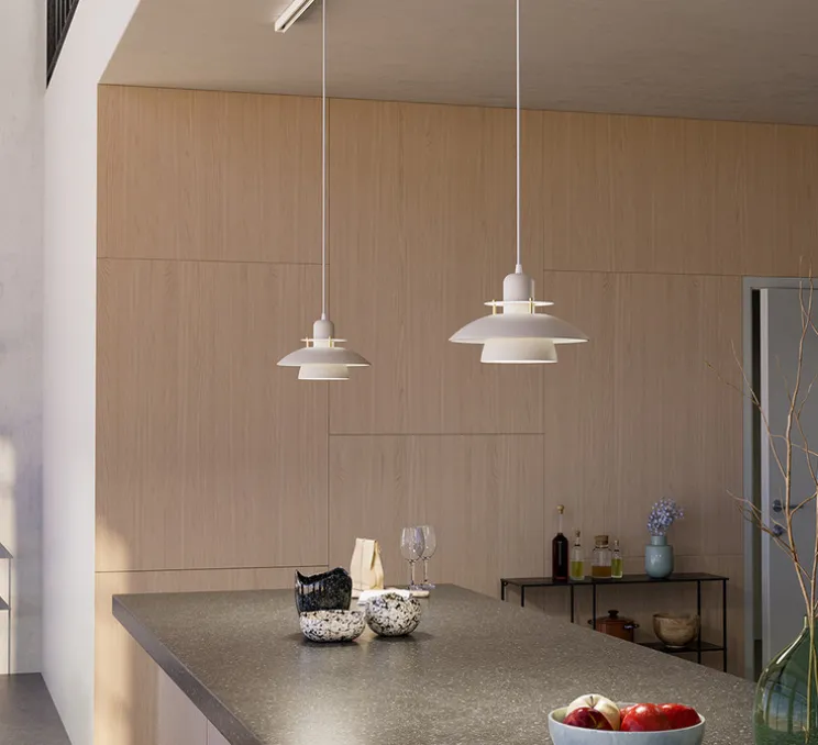 La Primus IV offre une silhouette circulaire minimaliste, qui reflète l’élégance scandinave. Avec son diamètre de 28 cm et sa hauteur de 19,6 cm, elle apporte une lumière diffuse et agréable tout en restant discrète dans son environnement. Elle se marie facilement à d’autres suspensions de la collection pour créer une harmonie lumineuse dans une cuisine ou un espace café.