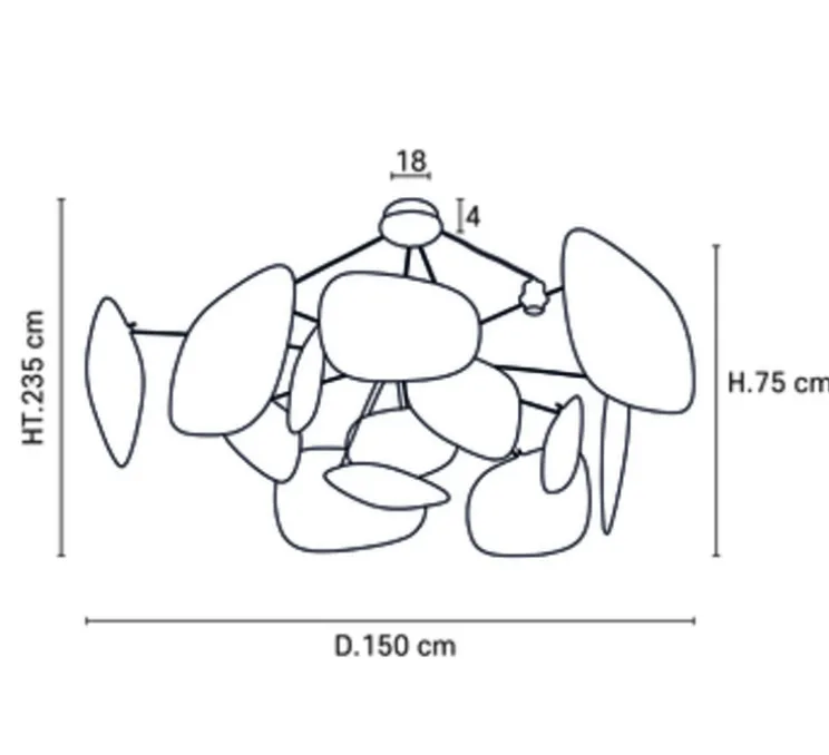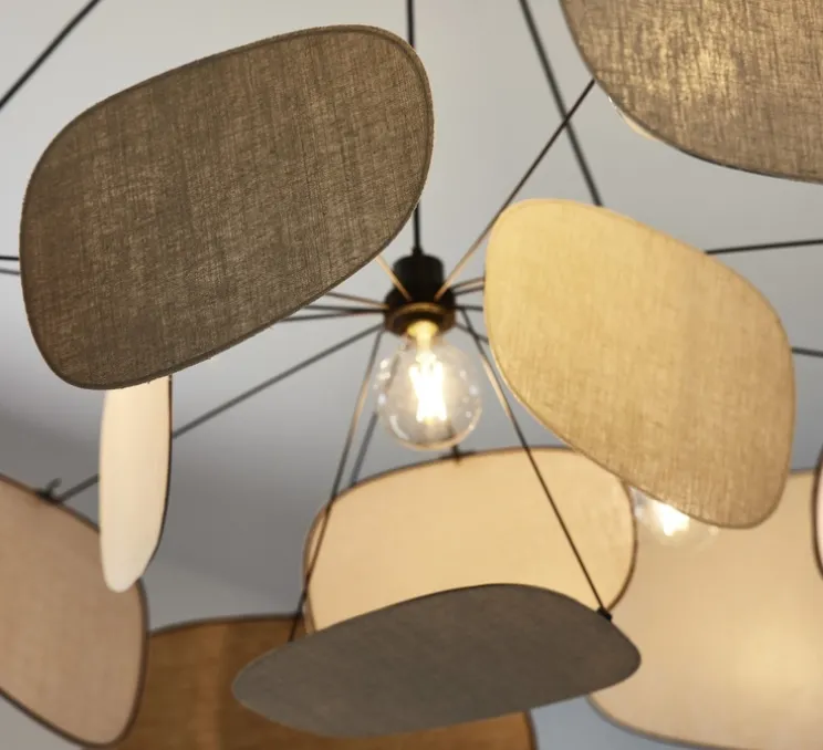 Ce lustre comprend une structure en métal peint ainsi que 13 écrans en lin.