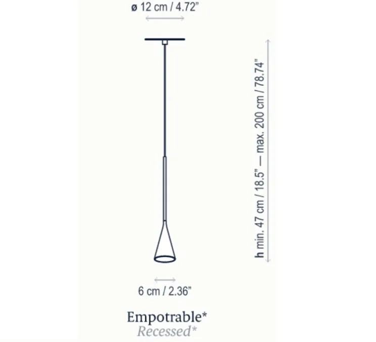 La hauteur de cette suspension est ajustable entre 47cm et 2cm de hauteur. Cette suspension est encastrée.