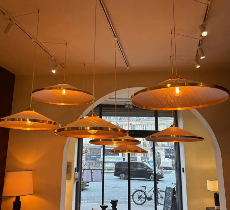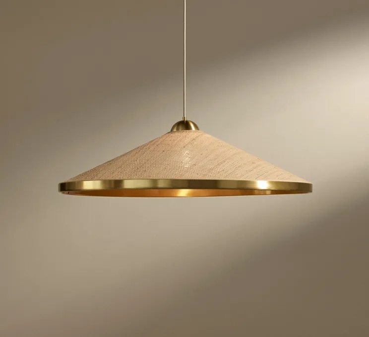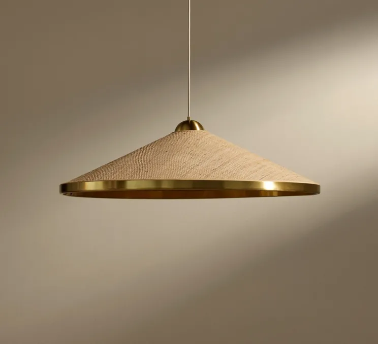Cette suspension joue sur l’alliance subtile du rabane et du laiton. Son design épuré et aérien capte instantanément le regard, offrant une présence élégante qui habille le plafond avec légèreté. Inspirée des tables de bistrot parisiennes, cette création met en valeur des matériaux nobles dans une composition harmonieuse.
