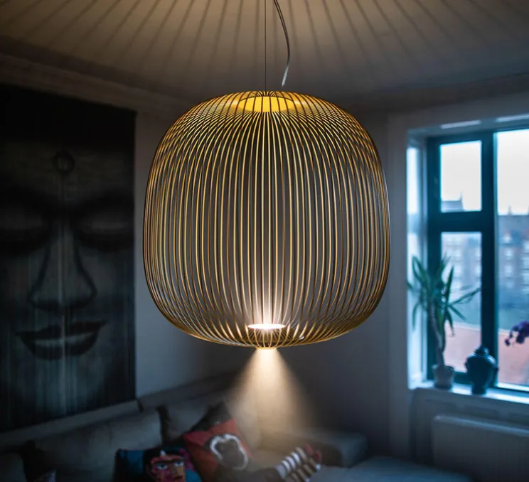 Le luminaire Spokes est composé d’un abat-jour à la forme organique, fait de rayons métalliques, tel une roue de vélo, avec une lentille à sa base, d’un câble en acier, d’un câble électrique et d’une rosace. Surprenante et élégante, la suspension Spokes se place individuellement ou en nuée de plusieurs, que ce soit une entrée, un restaurant ou un salon.