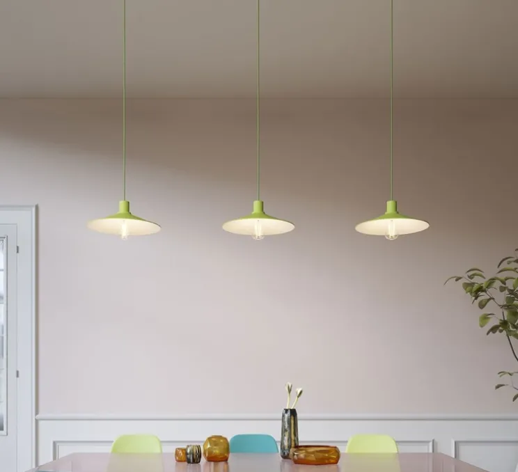 Avec son abat-jour en métal émaillé vert prairie, cette suspension ajoute une touche de fraîcheur et de vivacité à votre décoration. Les lignes épurées et les tons pastel s’intègrent parfaitement dans des cuisines, salles à manger ou chambres d’enfants, tout en accentuant la luminosité grâce à la finition intérieure blanche. Cette lampe, à la fois délicate et polyvalente, met en valeur l’ampoule pour un effet rétro et raffiné.