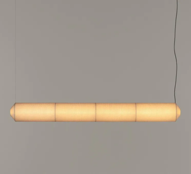 Tekio, qui signifie « adaptation » en japonais, fusionne tradition et modernité à travers un design contemporain et distinctif, mettant en avant des structures lumineuses délicatement enveloppées de papier artisanal. Inspiré par la lanterne japonaise traditionnelle en papier washi, datant du 14ème siècle et devenue un élément essentiel de la vie quotidienne au Japon, le designer londonien Anthony Dickens a su tirer parti de cette esthétique intemporelle. Le papier washi, notamment utilisé par Isamu Noguchi, est désormais inscrit au patrimoine culturel immatériel de l’humanité par l’UNESCO. Reconnaissant sa résistance et sa malléabilité exceptionnelles, le Washi offre une texture chaleureuse qui tamise la lumière de manière douce et subtile. La suspension Tekio Horizontal P4 se présente sous la forme d’un tube de 25cm de diamètre et 226cm de longueur.