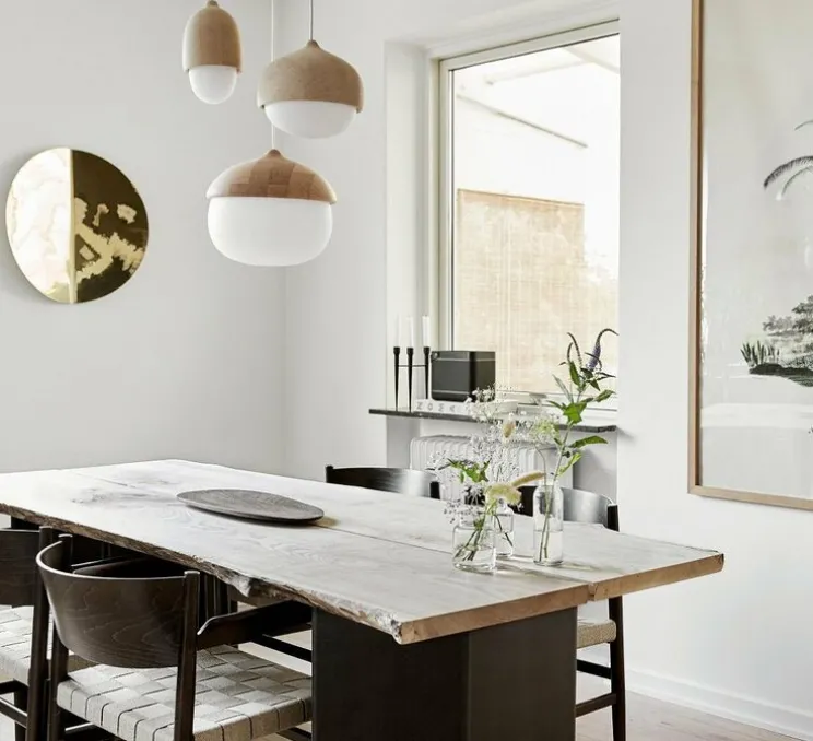 Au-dessus d’un plan de travail ou d’une table de salle à manger, la suspension Terho aime se présenter à plusieurs, à hauteurs différentes, dans ses trois tailles et deux finitions de bois.