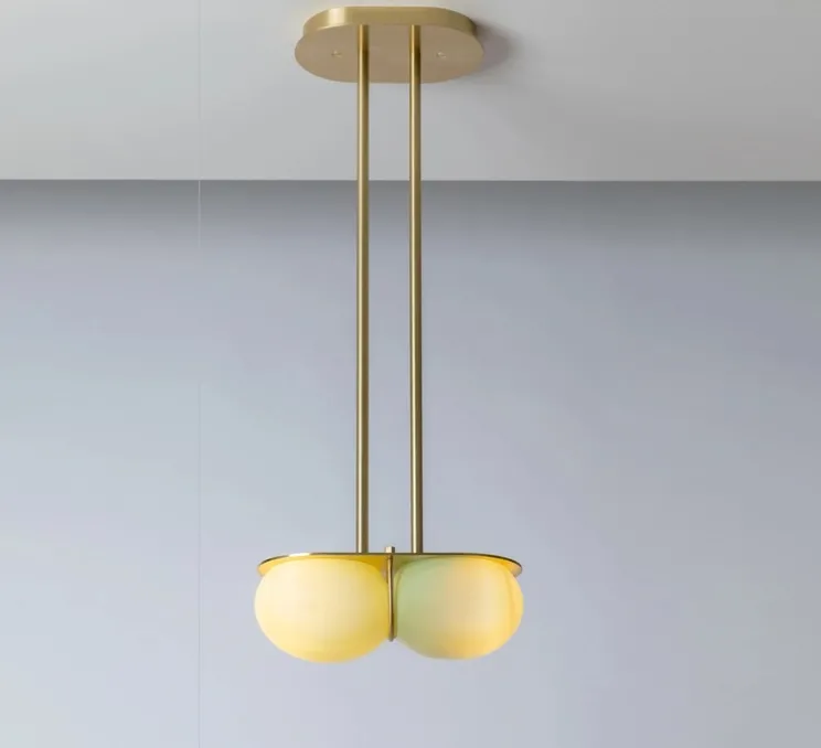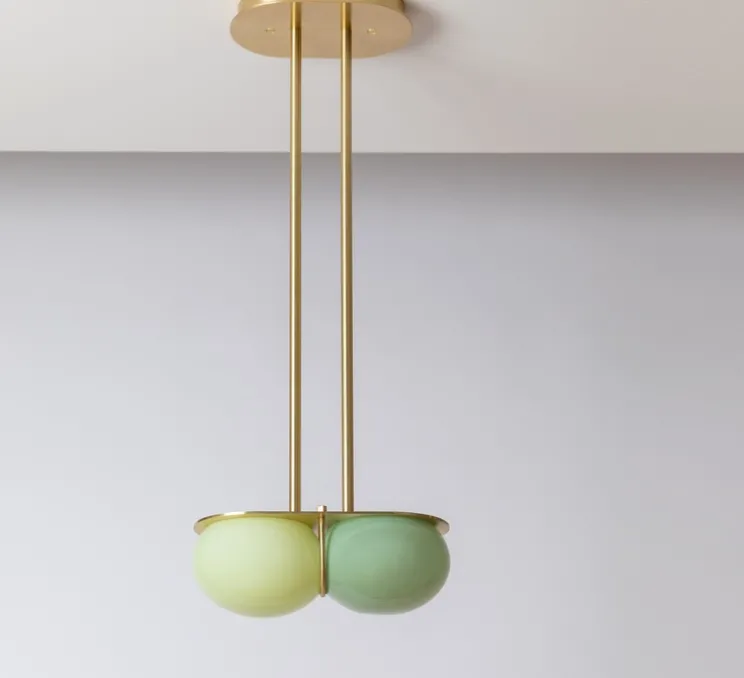 Découvrez la suspension Twin 4.0 en verre de couleur vert, finition laiton brossé, créée par le couple de designers Karen Gilbert et Paul Pavka pour l’emblématique maison d’édition, SkLO Studio.
