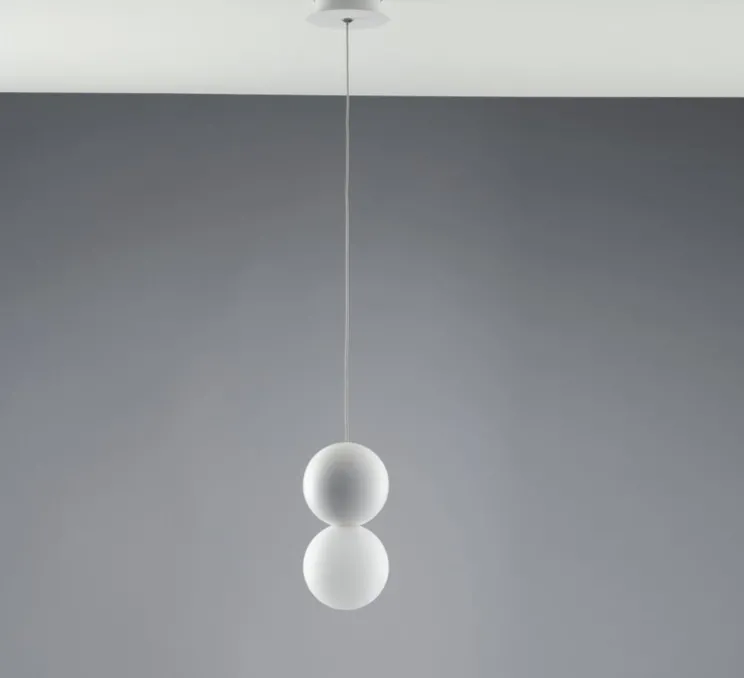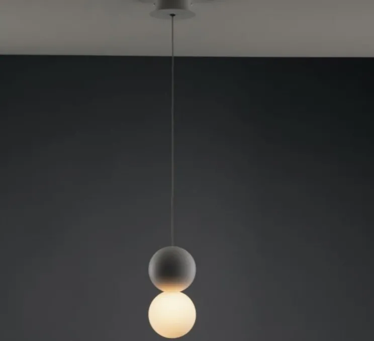 La suspension se caractérise par la juxtaposition du plâtre et du verre dépoli. Les deux matières sont associées de manière harmonieuse afin de proposer deux belles formes sphériques.