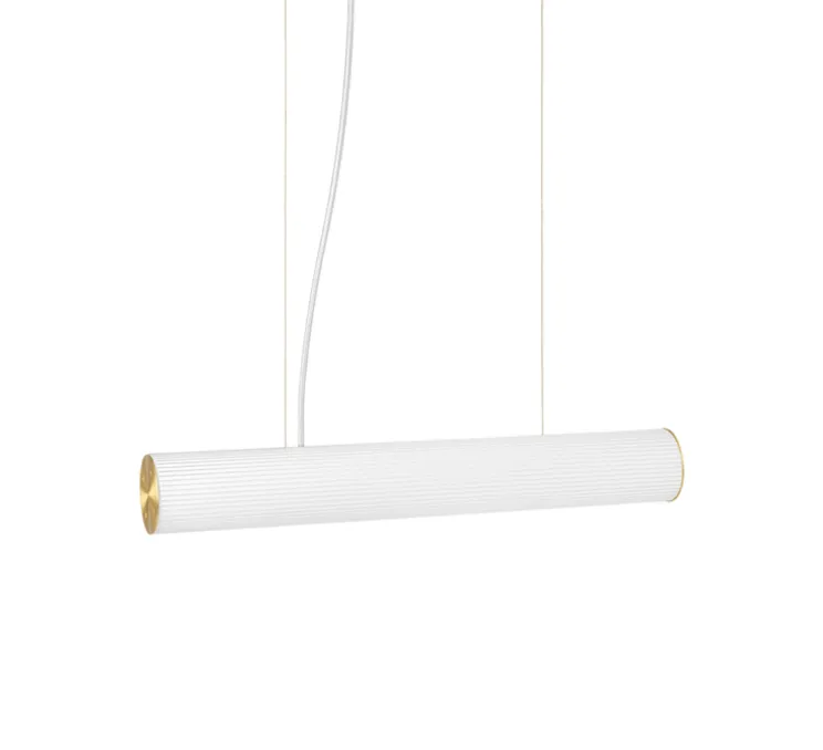Cette suspension tubulaire est en verre opale ondulé. Les finitions sont en laiton massif mat.