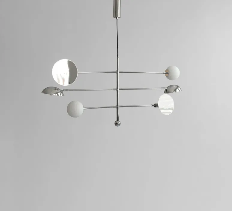 Composé de trois abat-jour distincts en métal et verre, Sahn joue sur les contrastes et les reflets du chrome pour créer une atmosphère lumineuse sophistiquée. Chaque bras orientable permet d’ajuster l’éclairage selon l’espace et l’ambiance recherchée. Idéal au-dessus d’une table à manger ou dans un salon, ce lustre devient un élément central de décoration tout en apportant une touche rétro-futuriste à votre intérieur.
