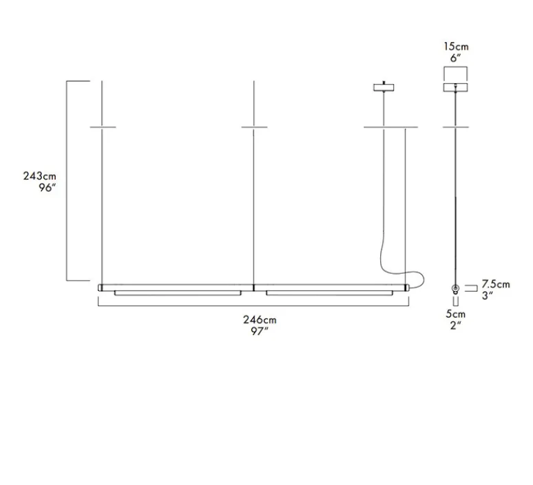 Le luminaire Pipeline est composé d’un long corps tubulaire, de deux diffuseurs tubulaires longeant la face inférieure du corps, de trois câbles avec attache plafond et d’une rosace avec transformateur. Minimaliste et raffinée, la suspension Pipeline se fond dans chaque intérieur, que ce soit dans des bureaux, un restaurant ou une salle à manger.