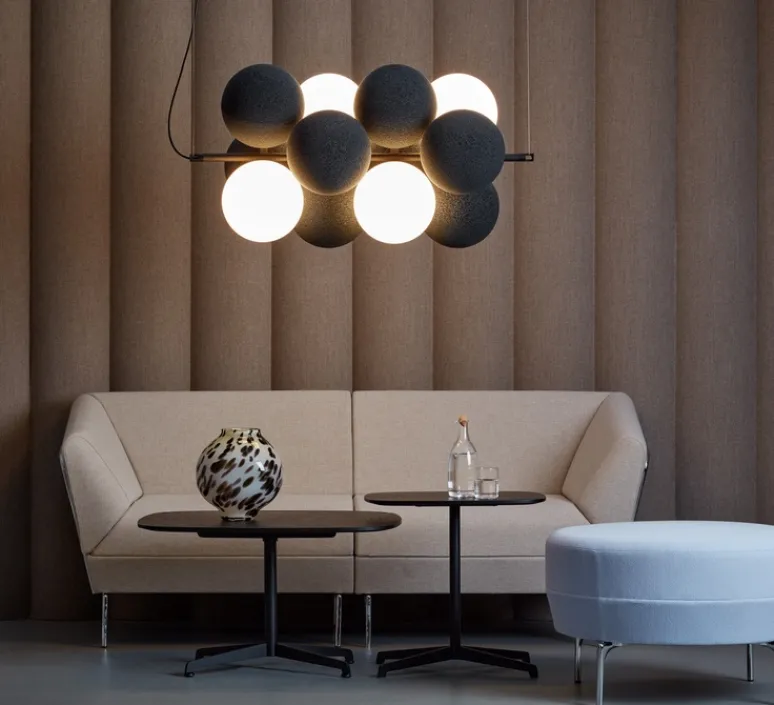 Ce luminaire en verre opale offre une belle lueur uniforme. Les absorbants sphériques souples sont fabriqués à partir de tissu recyclé dans le matériau Soundfelt REC et sont dotés d’un revêtement en tissu chiné tricoté en 3D (polyester) sans coutures. Le tissu est disponible en 3 coloris différents : Anthracite -20, Terracotta -21, gris clair -22. La suspension se décline en 2 versions : horizontale et verticale.
