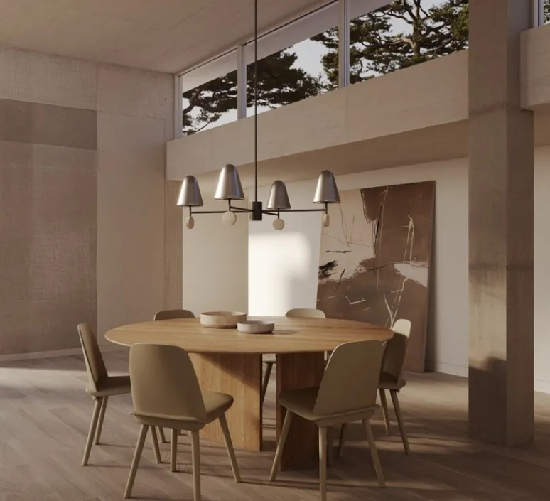 Avec ses quatre abat-jour coniques en métal finition nickel mat, terminés chacun par un disque en travertin, la suspension Stor évoque une composition graphique flottante. Son design minéral et sophistiqué permet de structurer visuellement un espace tout en conservant une belle légèreté. Parfaite au-dessus d’une grande table de salle à manger ou dans un séjour aux accents contemporains, elle devient un véritable point focal architectural.