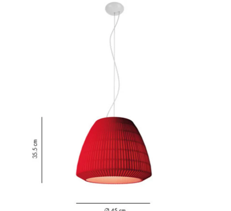 La suspension Bell réinterprète de façon originale la forme classique du dôme, tout en offrant une légèreté visuelle grâce à son tissu rouge et ses lignes douces. Ce luminaire s’intègre parfaitement dans des styles variés, notamment Japandi, alliant minimalisme scandinave et raffinement japonais. Bell apporte une touche chaleureuse tout en réduisant le bruit ambiant, en faisant un choix judicieux pour les salons, salles de réunion ou espaces professionnels. Son câble de 2,8 mètres permet une installation personnalisée selon la hauteur de plafond.