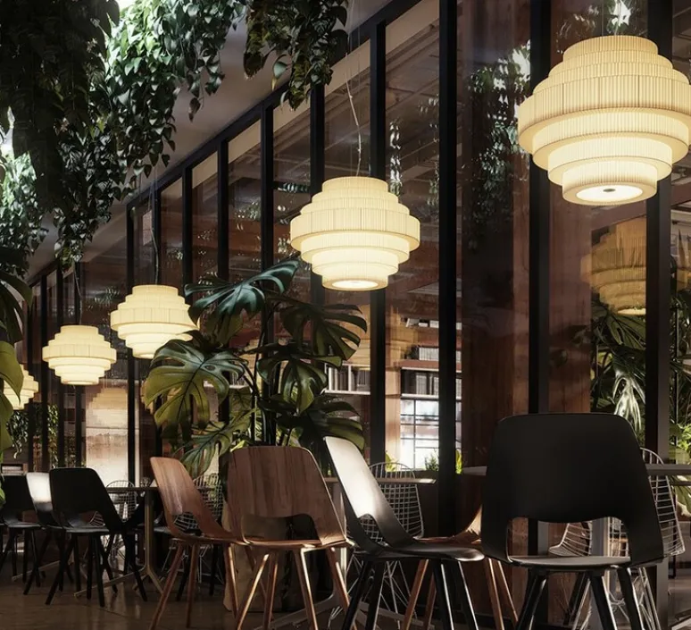 Des lampes de grand format, une lumière chaude, de grosses boules de forme circulaire qui remplissent l’espace et deviennent des éléments décoratifs de haut niveau avec un grand confort lumineux. Grâce à ses grandes dimensions, les MOS sont spécifiquement indiquées pour le marché contractuel et l’usage intérieur. Sa structure se termine par un diffuseur en verre opalin qui mélange et dirige la lumière du bas. MOS a été fabriqué manuellement avec un ruban translucide.