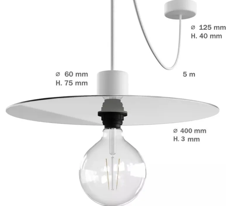 Eiva Elegant mesure 40 cm de diamètre pour 7,5 cm de hauteur. L’ampoule Led E27 d’une puissance maximale de 6W n’est pas fournie mais est recommandée pour le bon fonctionnement du luminaire. Douille et rosace en silicone.