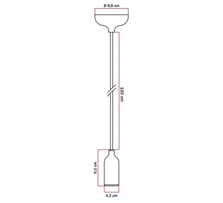 La suspension mesure 4,3 cm de diamètre et 9,2 cm de hauteur, avec un câble en coton blanc d’une longueur de 1,2 mètre. Elle diffuse une lumière à 360 degrés, parfaite pour un éclairage d’ambiance. L’ampoule E27 d’une puissance maximale de 53W n’est pas fournie mais est recommandée pour le bon fonctionnement de la suspension. Le luminaire n’est pas dimmable. Rosace assortie incluse.