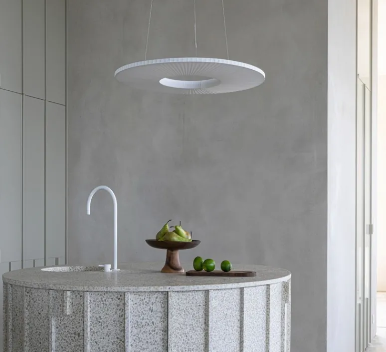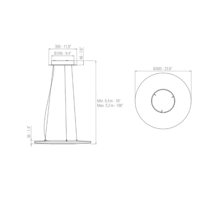 Cette suspension a un diamètre de 60cm pour 3,6cm de profondeur. La source lumineuse 2700K, 5250lm est fournie.