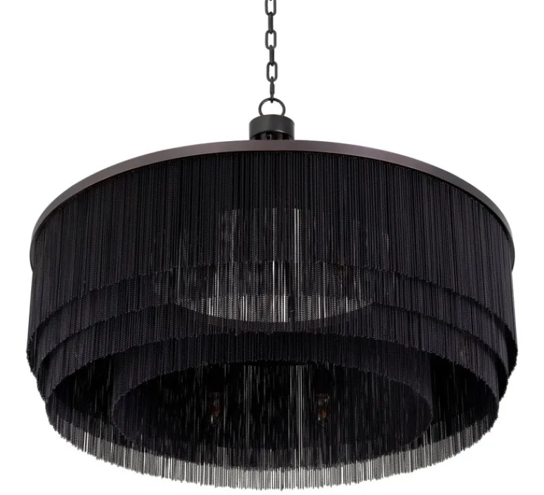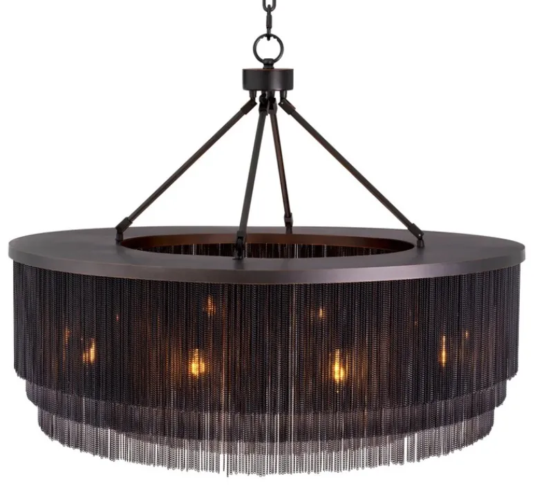 Le lustre Tissot L de Eichholtz est une pièce expressive qui évoque le glamour des années folles via ses rangées de chaînes fines disposées en franges rappelant les robes des années 1920.