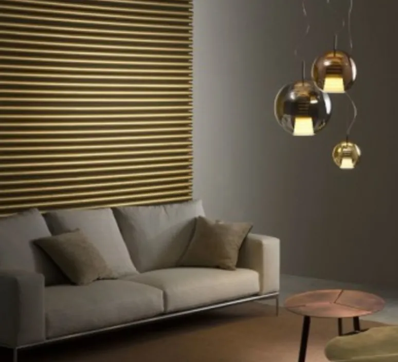 Cette suspension sphérique en verre soufflé transparent possède une finition spéciale de couleur dorée grâce à un travail de métallisation unique sur titane. Beluga Royal scintille comme une perle grâce à sa lumière et à la lumière reflétée par l’environnement. Précieuse, grâce aux finitions métalliques, son aspect est exalté par tout ce qui l’entoure, en transformant les couleurs, les reflets et les formes. Dès qu’elle est allumée, la suspension devient indiscutablement l’élément principal de l’espace dans lequel elle se trouve en le définissant à travers des jeux de lumière créés par l’abat-jour.