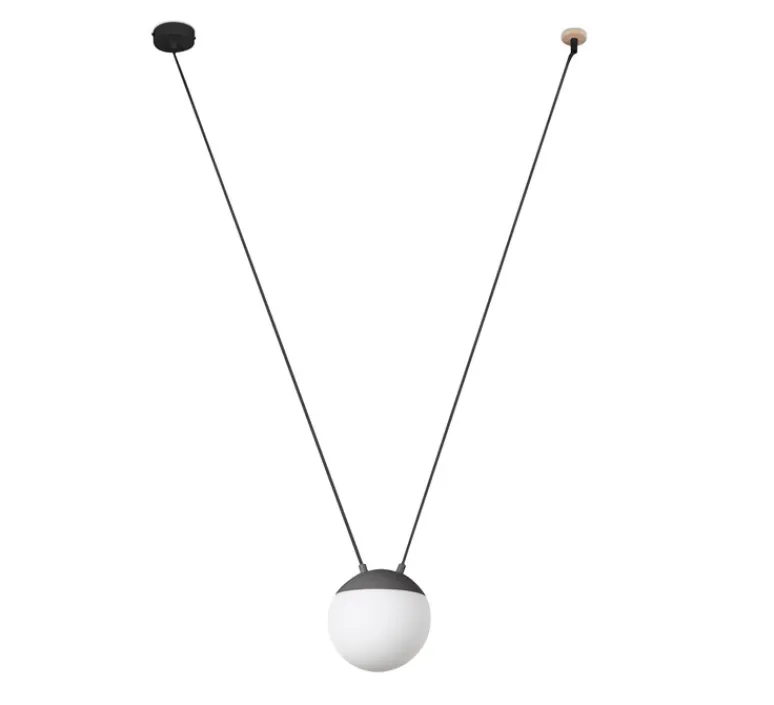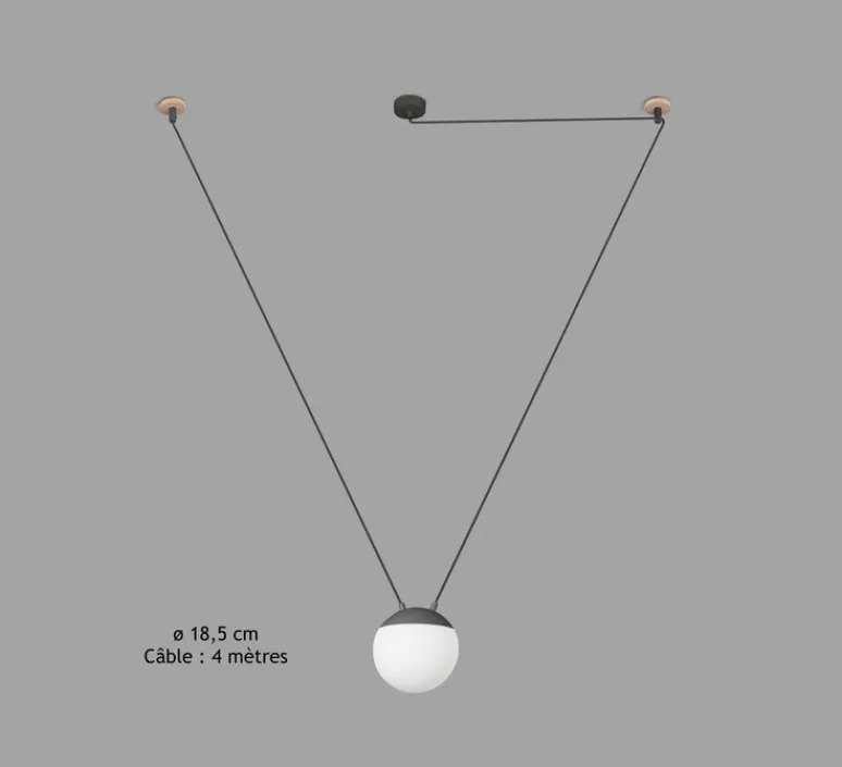 La structure de la suspension est en métal et son diffuseur en verre opale, coloris blanc ou gris foncé. Selon vos besoins, la suspension peut contenir jusqu’à 5 diffuseurs qui éclairent chaleureusement une pièce. Design et versatile, cette suspension est également personnalisable grâce à des petits crochets à fixer au plafond (nombre de crochets sur demande).