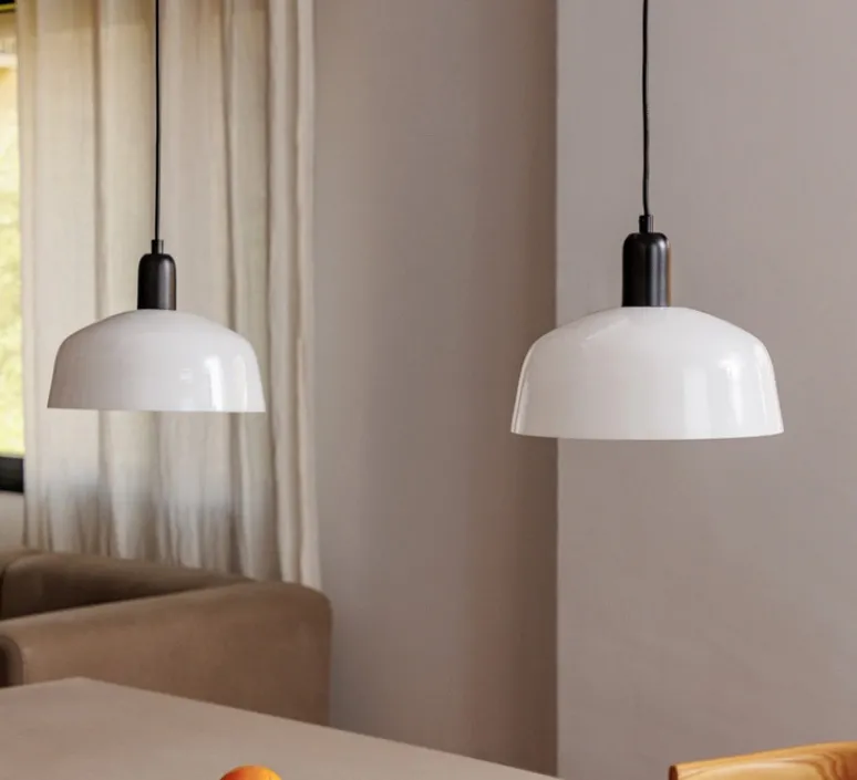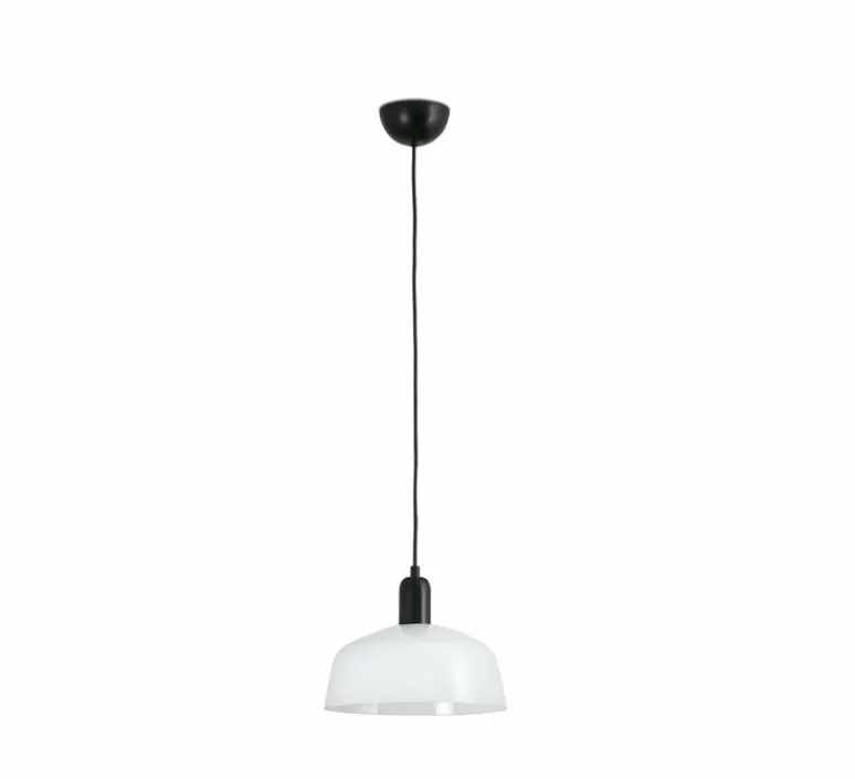 A la fois compacte et élégante, le luminaire présente un corps en aluminium et un abat-jour en verre opalin blanc. Il offre un éclairage direct et un confort visuel. La suspension possède un câble de 2m.